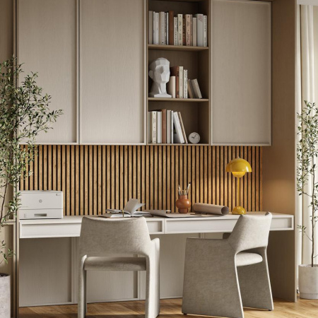 Изготовлен из экологичного волокна, устойчив к влаге, долговечен, воздухопроницаем, преломляет и подавляет звуковые волны. Декор панелей – рейки из мебельного МДФ, облицованные экошпоном: устойчивы к деформации, создают визуальный и тактильный эффект комфорта. Аналог деревянной рейки для стен в интерьере.