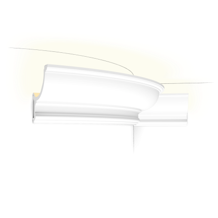 Гибкая версия C334. Элегантный классический карниз в виде гусиной шеи. Круглые стены или изогнутые поверхности не представляют никакой трудности для технологии Flex. Примечания: Используйте DecoFix Power. Для крепления к стене должны использоваться шурупы. Flex Radius: R min = 380 cm